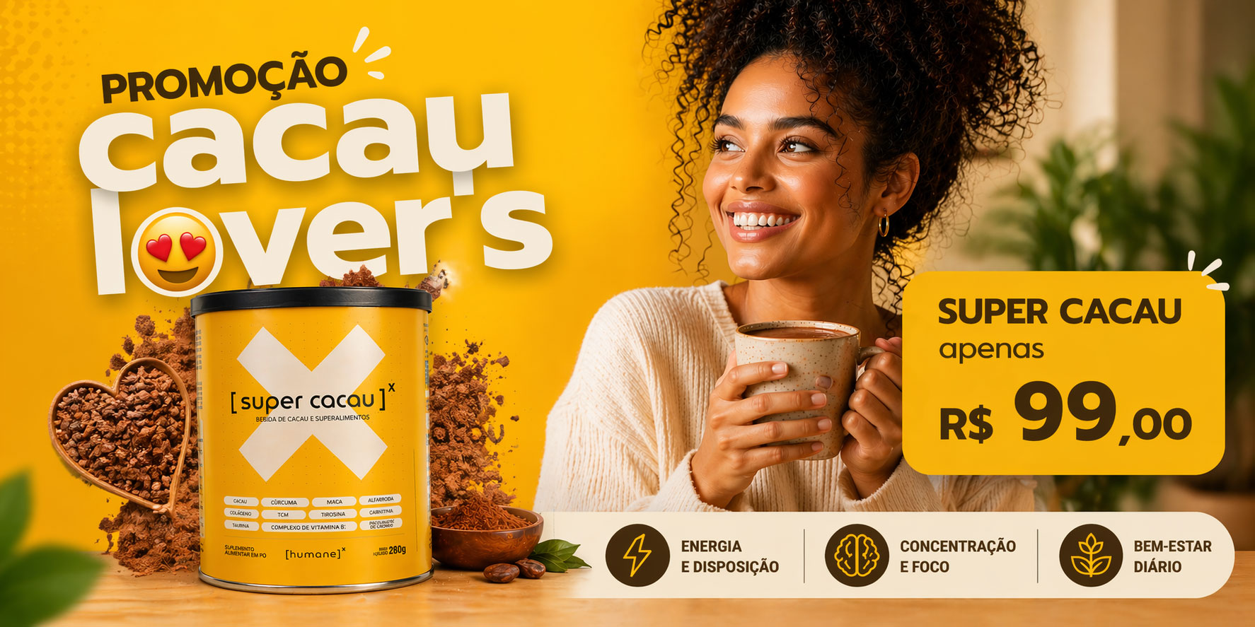 O Super Cacau é um blend poderoso a base de cacau e outros superalimentos, vitaminas e aminoácidos para dar mais energia e foco, sem a ansiedade do excesso da cafeína.
